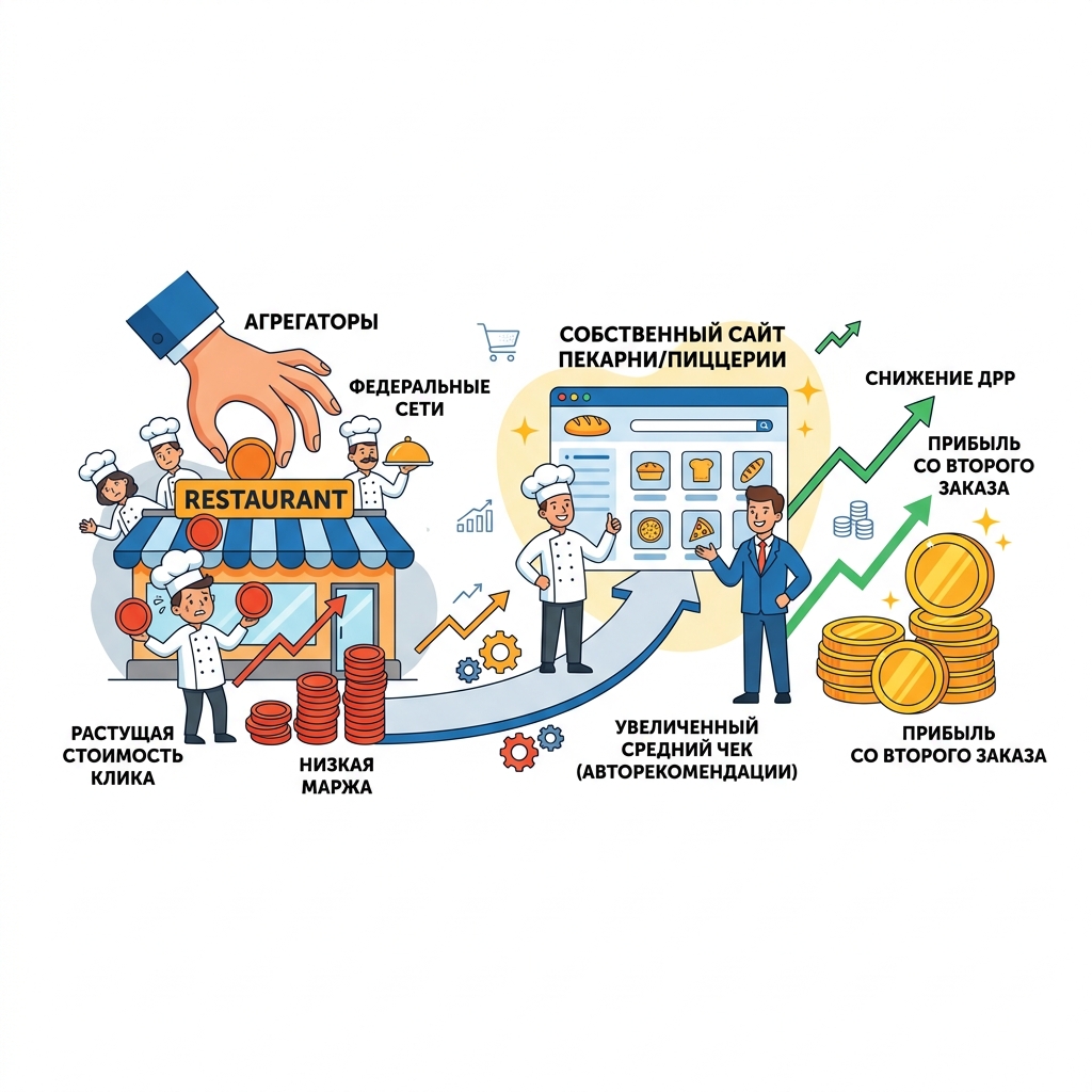Рынок доставки готовой еды перегрет. Локальным заведениям приходится конкурировать не только с соседними точками, но и с федеральными сетями, обладающими гигантскими бюджетами. Главный вызов индустрии — низкая маржинальность первого заказа. Стоимость клика в контекстной рекламе стабильно растет, поэтому прибыль формируется только со второго или третьего обращения клиента.